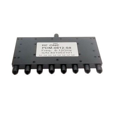 PDM-0812-S8 is a 8 way power divider/combiner that covers the frequency range of 8-12 GHz. This RF coaxial SMA power divider/splitter has a 50 Ohm nominal impedance and a maximum input power of 20 watts as a divider. It uses the Wilkinson splitter design with high isolation, low insertion loss, good VSWR match and excellent phase and amplitude balance.